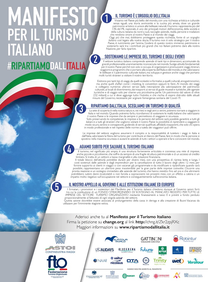 Instituciones y empresas de turismo de Italia, unidas con la firma del llamado "Manifesto per il turismo italiano #RIPARTIAMODALLITALIA para salvar la industria.