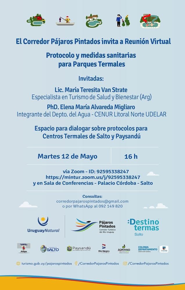 Al respecto, el CPP anunció una reunión virtual via Zoom, sobre Protocolo y Medidas Sanitarias para Parques Termales. Las oradoras serán la Lic. María Teresita Van Strate, argentina, especialista en Turismo de Salud y Bienestar, y la PhD. Elena María AlvaredaMigliaro, integrante del Departamento del Agua - CENUR Litoral Norte, UDELAR.
