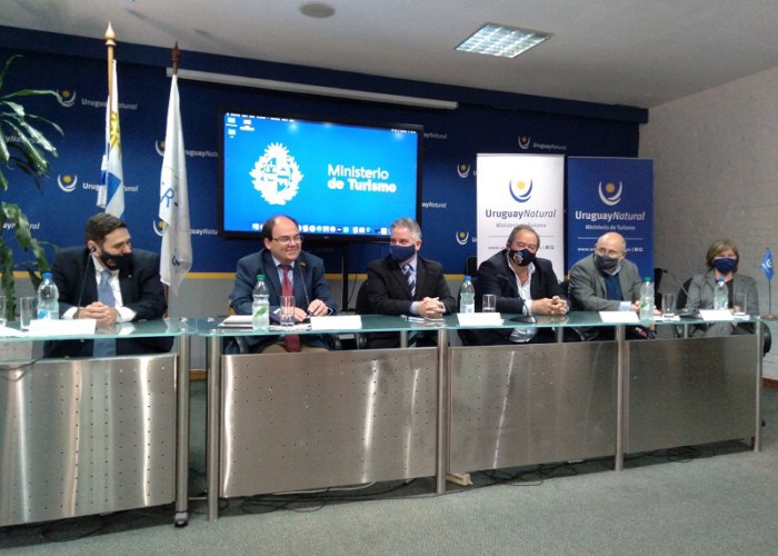 En el lanzamiento en el MINTUR: Eugenio Bidondo, DT de Flores; intendente departamental Diego Irazábal; asesor ministerial Oscar Iroldi; Álvaro Fagalde, secretario general de la intendencia; Juan Martínez, Pte. de la CAMTUR; Doris Rodríguez, del MINTUR