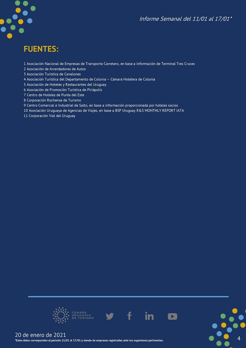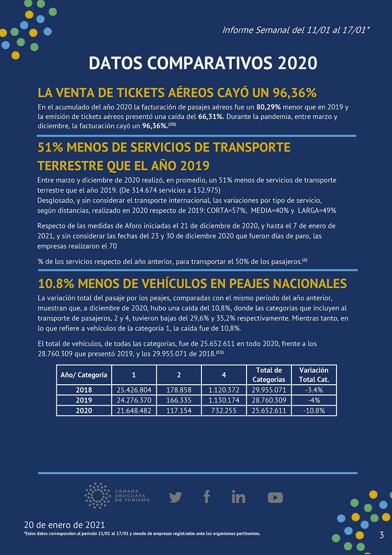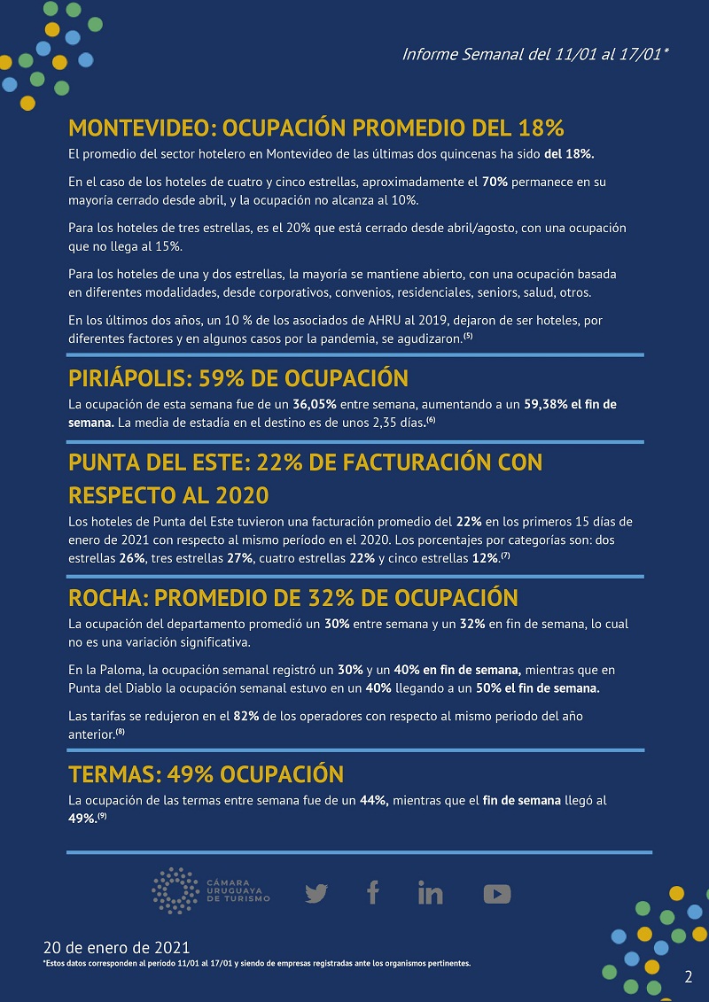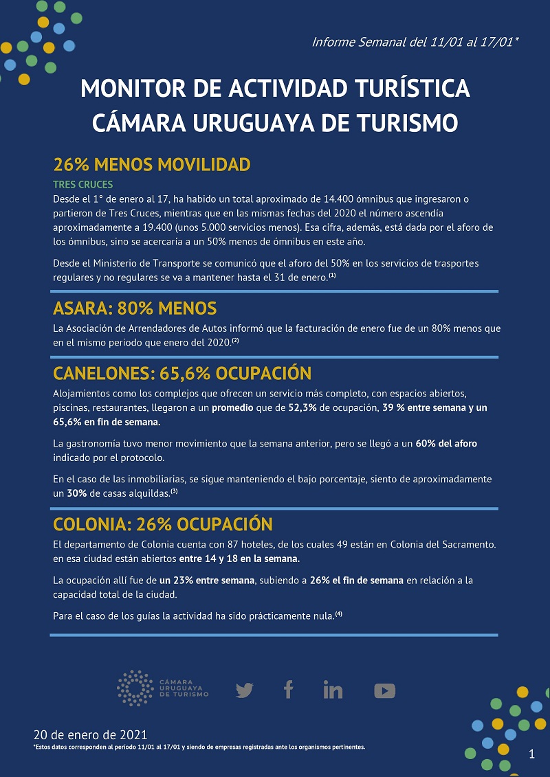 La Cámara Uruguaya de Turismo publicó el miércoles 20, la tercera entrega del Monitor de Actividad Turística con datos del 11 al 17 de enero de 2021.
