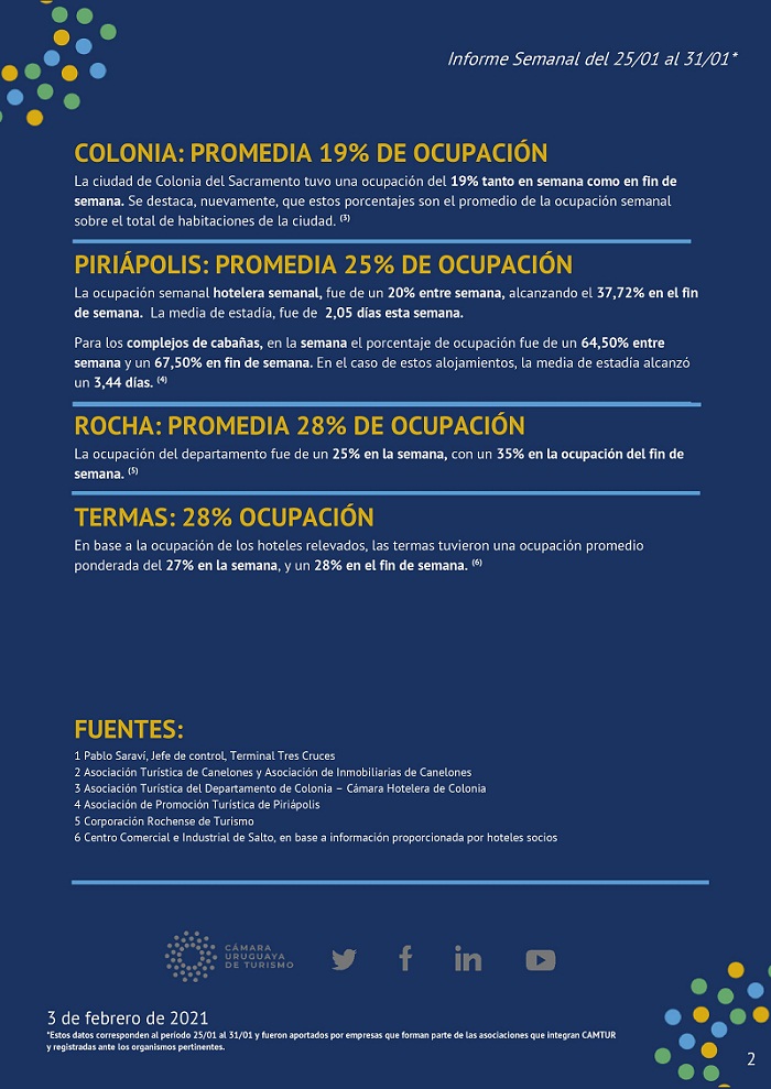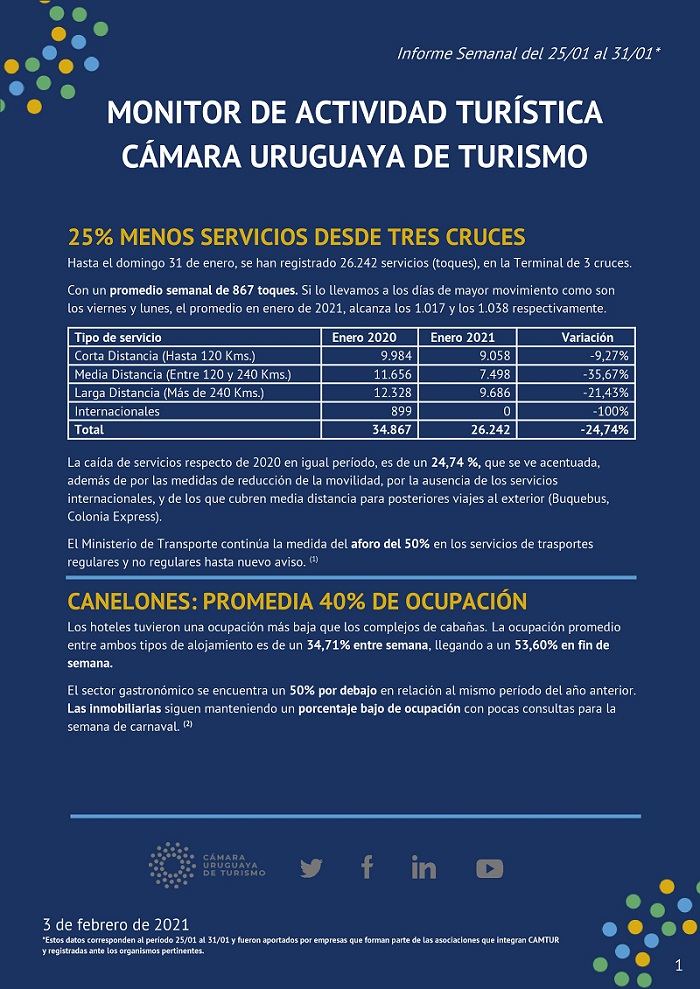 Algunos de los destinos importantes del Uruguay: Rocha, Piriapólis, Termas, Colonia, Canelones, así como la principal terminal de transporte colectivo terrestre de corta, media y larga distancia y buses internacionales, fueron monitoreados por la Cámara Uruguaya de Turismo del Uruguay en la última semana del mes de enero 2021.