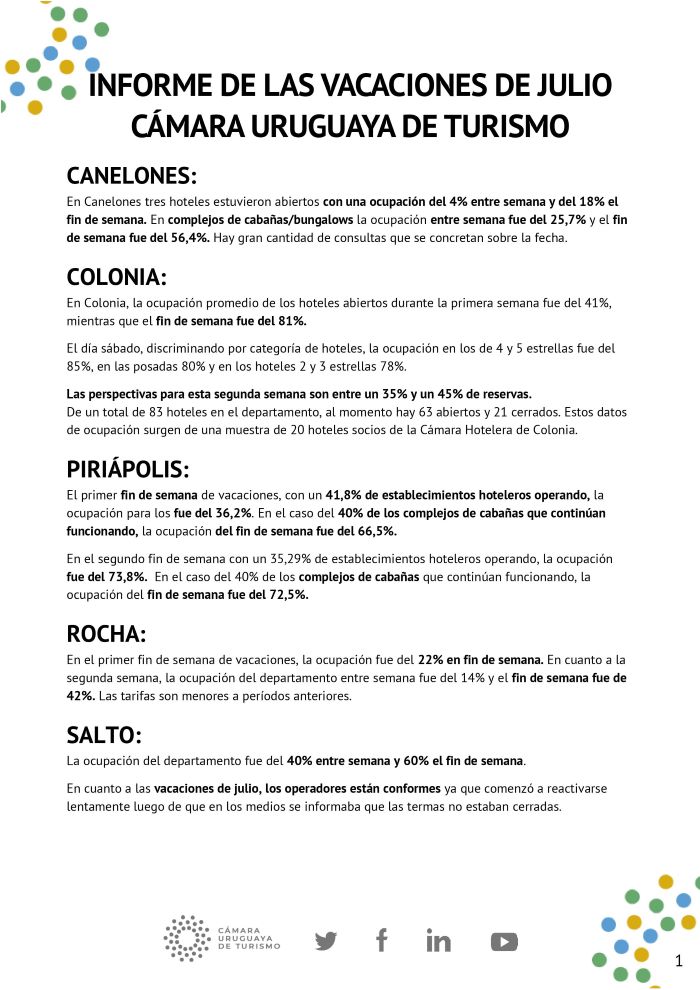 Las tradicionales vacaciones de invierno, este año se desarrollaron desde el lunes 28 de junio al domingo 11 de julio. La Cámara Uruguaya de Turismo emitió un informe de su monitor de la actividad turística.