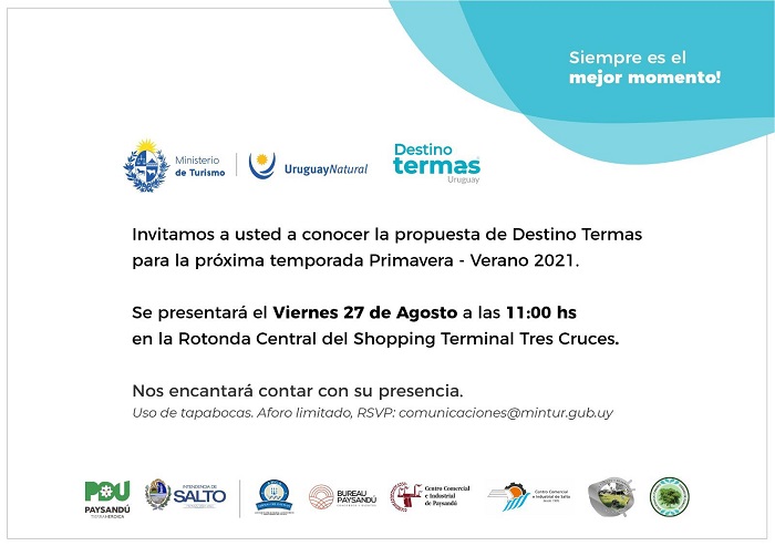 Esa es una de las tantas acciones promocionales que está encarando el Ministerio de Turismo para destacar el Destino Termas. El viernes 27, en la rotonda de la Terminal Tres Cruces en Montevideo, se va a proceder al lanzamiento de la Temporada Primavera-Verano de Destino Termas, con la participación de autoridades nacionales, regionales, departamentales, locales y de las asociaciones de operadores privados de Paysandú y Salto.