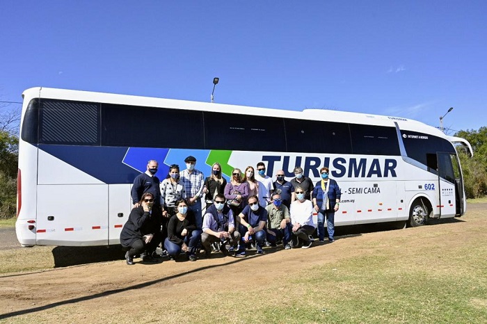 galería de imágenes: Eduardo Segredo, M. Elisa Fernández y María Shaw, del CIPETUR, con José Manuel Galván, director de Turismo de Paysandú, en Termas de Guaviyú. 2.- El grupo de periodistas se movilizó en bus de Turismar.