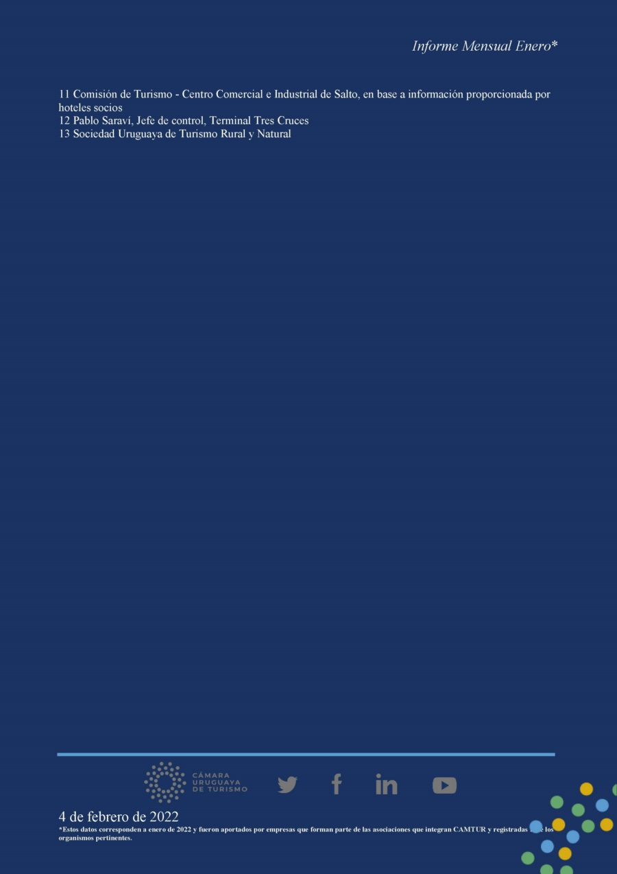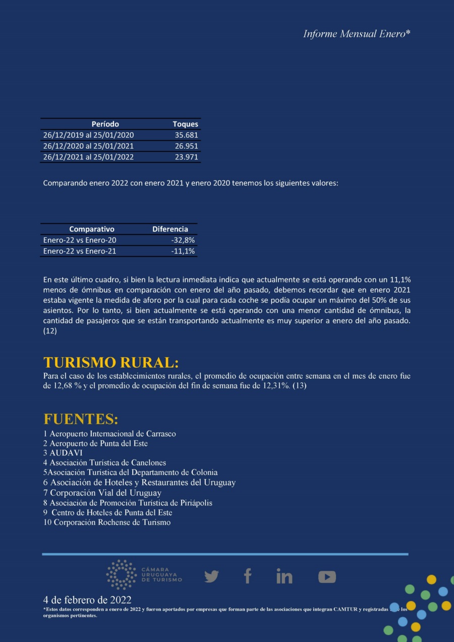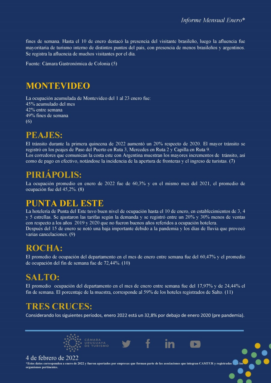 La Cámara Uruguaya de Turismo emitió su informe mensual correspondiente a enero de 2022. El mismo se elaboró el 4 de febrero, con datos aportados por empresas que forman parte de las asociaciones que forman la CAMTUR, registradas ante los organismos competentes.