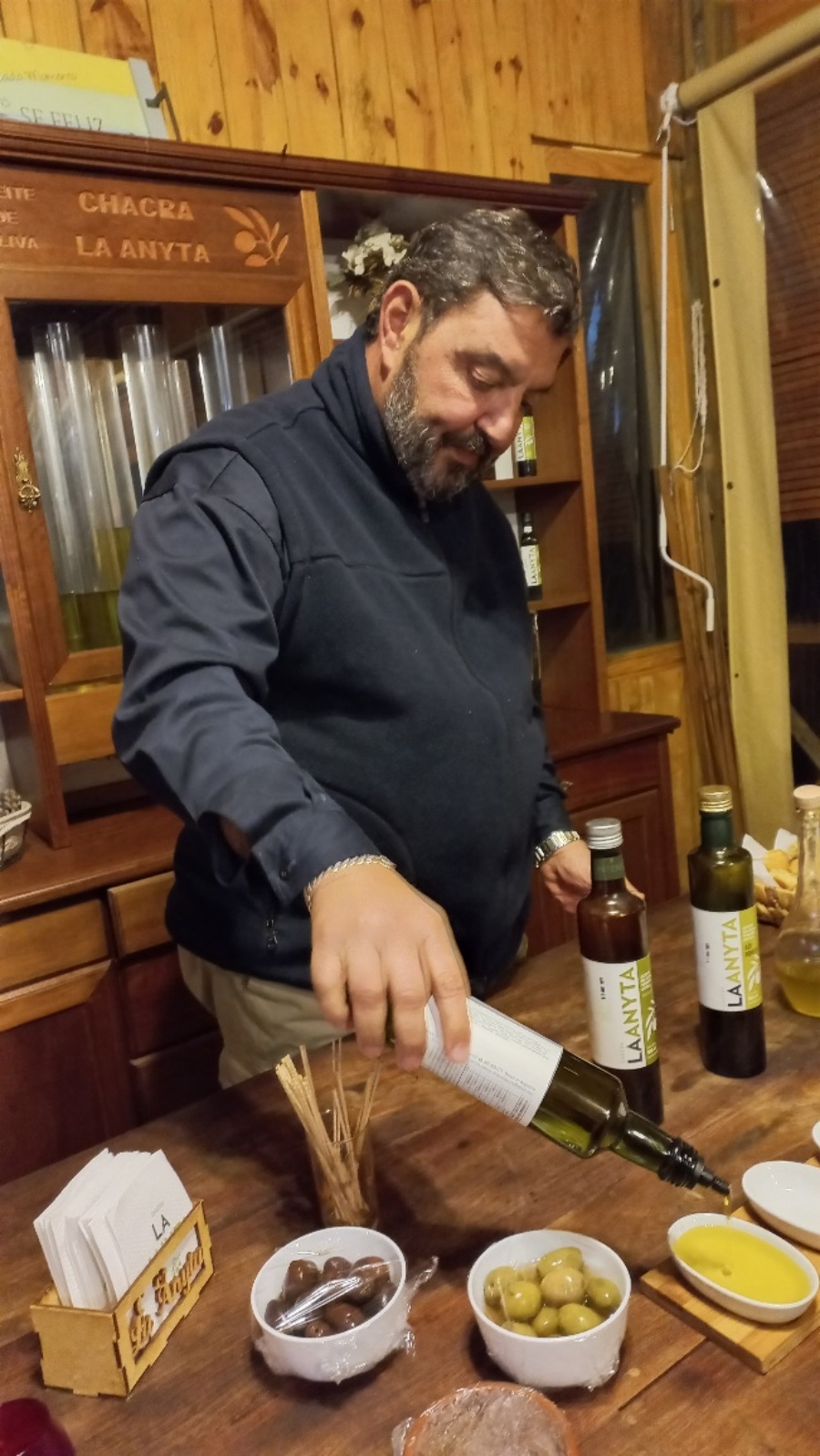 Ana y Alejandro Di Tulio, propietarios del Grupo La Anyta -con sus cinco chacras (La Anyta, Las Marías, La Rosita, Ruta 60 y Brisas)-, nos recibieron al final de la jornada. Es un emprendimiento de esta pareja de argentinos que llegó a la zona en 2013. Comenzaron con una plantación de 1400 olivos en 5 hectáreas y con el tiempo incorporaron nuevos terrenos. Hoy tienen un total de 9000 plantas y 30 hectáreas de tierra. Cuentan con su propia almazara y con un laboratorio. Sus especialidades son el aceite de oliva virgen extra, así como el lemoncello y la línea cosmética.