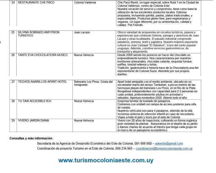 En el marco del 20º aniversario de la Agencia de Desarrollo del Este de Colonia, tenemos el gusto de invitar a Ud. a la Primera Feria de presentación de la oferta turística de Colonia Este, que tendrá lugar el día martes 6 de octubre y además a ser parte de la feria , desde las 10 a las 13 horas, en Salón el Recreo, Mont Petit Hotel de Campo (Ruta 1 km 127,500, Rosario).