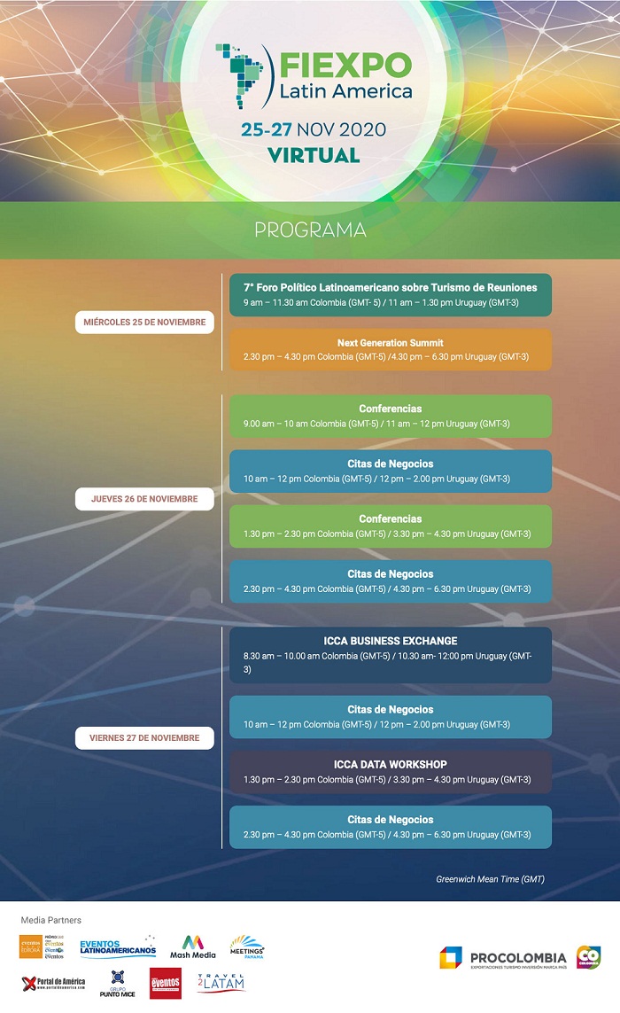 El jueves 26, a las 10.45 horas de Uruguay se realizará la Ceremonia de Apertura de FIEXPO, la Feria del Mercado de Reuniones e Incentivos de América Latina y el Caribe, para luego proceder con las conferencias de alto nivel, sesiones educativas y citas de negocios. A última hora será la entrega de premios. Mientras que el viernes 27, será el turno de ICCA Business Exchange y el ICCA Data Workshop, intercaladas con citas de negocios. (Ver programa al pie).