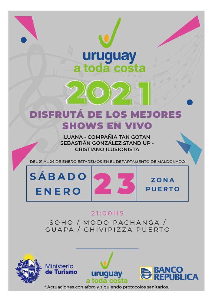 Todavía quedan muchos lugares por recorrer. Esta semana el programa Uruguay a Toda Costa se presentará en el departamento de Maldonado, con el show en vivo de Luana, Compañía Tan Gotán, Sebastián González Stand Up y Cristiano Ilusionista. La apertura fue el jueves en la Av. Gorlero, en Capi Bar, Bigote, Watashi y Fragata. El viernes van a La Barra; a las 21.30 en Pico Alto, Tati Juana y Capi Bar, y a las 23 hs. en la zona Design. El sábado, a las 21 hs. estarán en la zona del Puerto de Punta del Este, en Soho, Modo Pachanga, Guapa y Chivipizza. Mientras que el domingo se trasladan a Piriápolis, a las 21.30 hs. en La Rinconada, el Puertito Don Anselmo, Drakar y La Goleta.