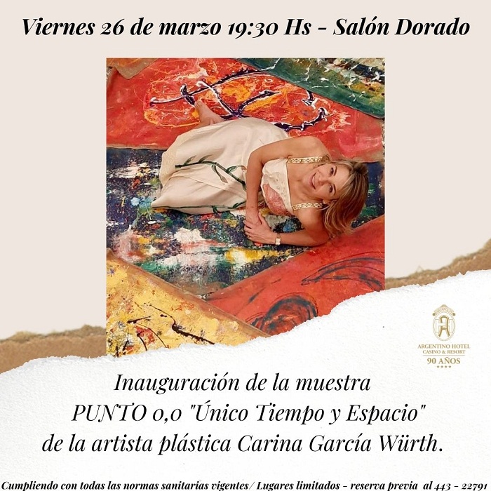 Salón Dorado - Hora 19 y 30 - Inauguración de la Muestra "PUNTO 0,0 "Único Tiempo y Espacio" a cargo de la Artista CARINA GARCIA WURTH . Abierta al público durante toda la Semana de Turismo. A partir de su exploración de diferentes estilos pictóricos y gamas cromáticas y después de haber podido compartir con grandes Artistas Contemporáneos Sudamericanos, la artista, que es autodidacta , explicará cómo se adentró en la abstracción donde se encontró verdaderamente libre para desarrollar su creatividad.