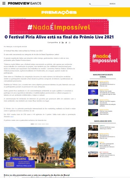 Chabot Producciones representó a Uruguay de manera estelar presentando al concurso Premio Live dos eventos organizados por la empresa (uno corporativo y uno temático), siendo preseleccionado el Festival Piria Alive para concursar en la votación general en la que participaron más de 11 mil votantes (en su mayoría lectores de Promoview, experientes profesionales y especialistas en las diversas áreas de actuación), para elegir a los ganadores.