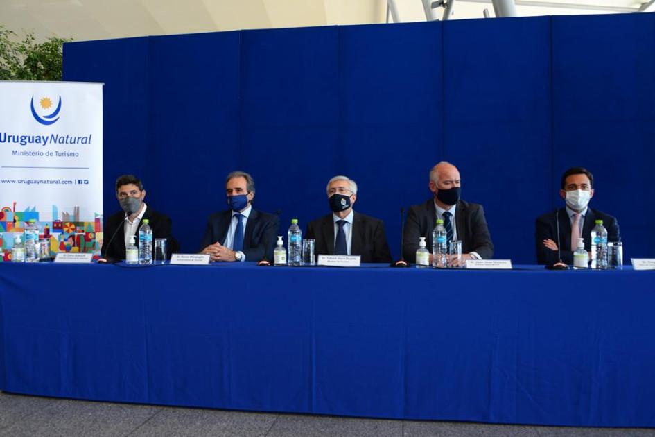 Horacio Yanes, director de Turismo de Canelones; Roque Baudean, director nacional de Turismo; ministro de Turismo, Tabaré Viera; María Shaw, presidente del CIPETUR; subsecretario de Turismo, Remo Monzeglio; Daniel López, presidente de la ATC; y Diego Arrosa, CEO de Corporación América Uruguay