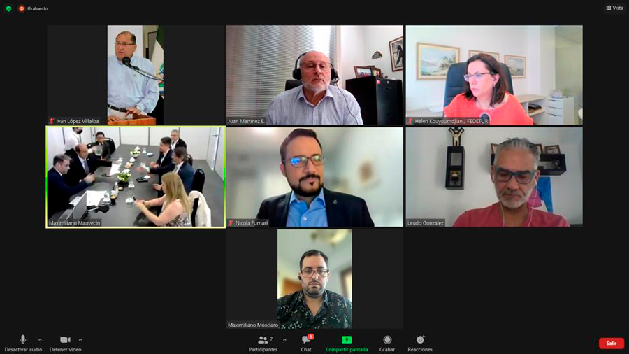 Mauricio Mauvecín, coordinador de la FEDESUD; Marcelo García, secretario de la CAT; Aldo Elías, past presidente de la CAT; Marina Cantera, Pte. de la CAMTUR; Carlos Canales, Pte. de la FEDESUD y Pte. de la CANATUR; Marco Antonio Mercado, Pte. de la ABAVYT; Francisco Rodríguez, vicepresidente de la CAMTUR