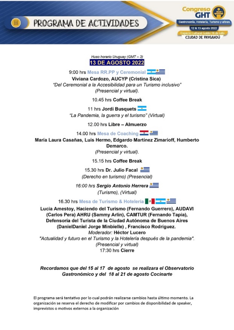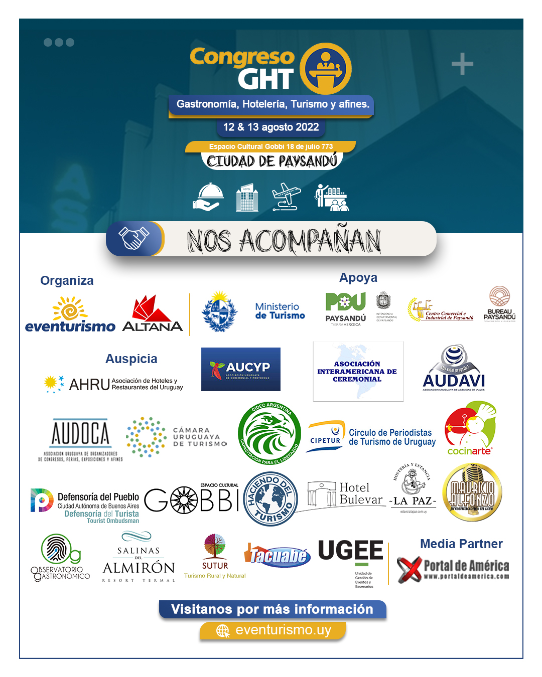 El Congreso GHT (XIII Congreso Nacional y V Congreso Latinoamericano GHT, Gastronomía, Hotelería, Turismo y afines) tendrá lugar los días 12 y 13 de agosto de este año en las instalaciones del Espacio Cultural Gobbi de la Ciudad de Paysandú, ubicado en la calle 18 de julio 773.