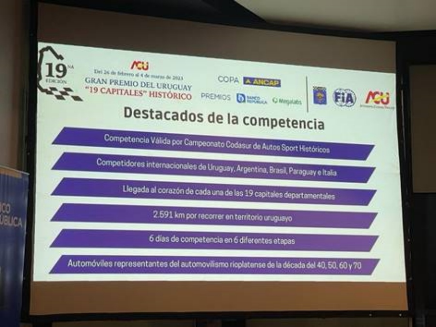 El Automóvil Club del Uruguay (ACU) llevará a cabo la XIX edición del Gran Premio del Uruguay 19 Capitales Histórico, desde el domingo 26 de febrero hasta el sábado 4 de marzo.