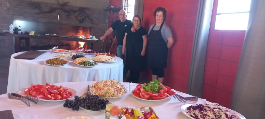 En las mesas de manteles blancos, reinaba una gran tabla de quesos, fiambres, grisines y panes, en una exquisita variedad, donde se destacaba una salsa de vino tinto para untar. Nos esperaba “el mejor asado del mundo, acompañado por los mejores vinos”. ¡Doy fe! Y también de la mesa de ensaladas, sabrosas, variadas y abundantes. Y ni qué hablar de los postres, elaborados por reposteras de la comarca. Creo que nunca había probado una “Rogel” tan delicada! ¡Y no exagero!!!