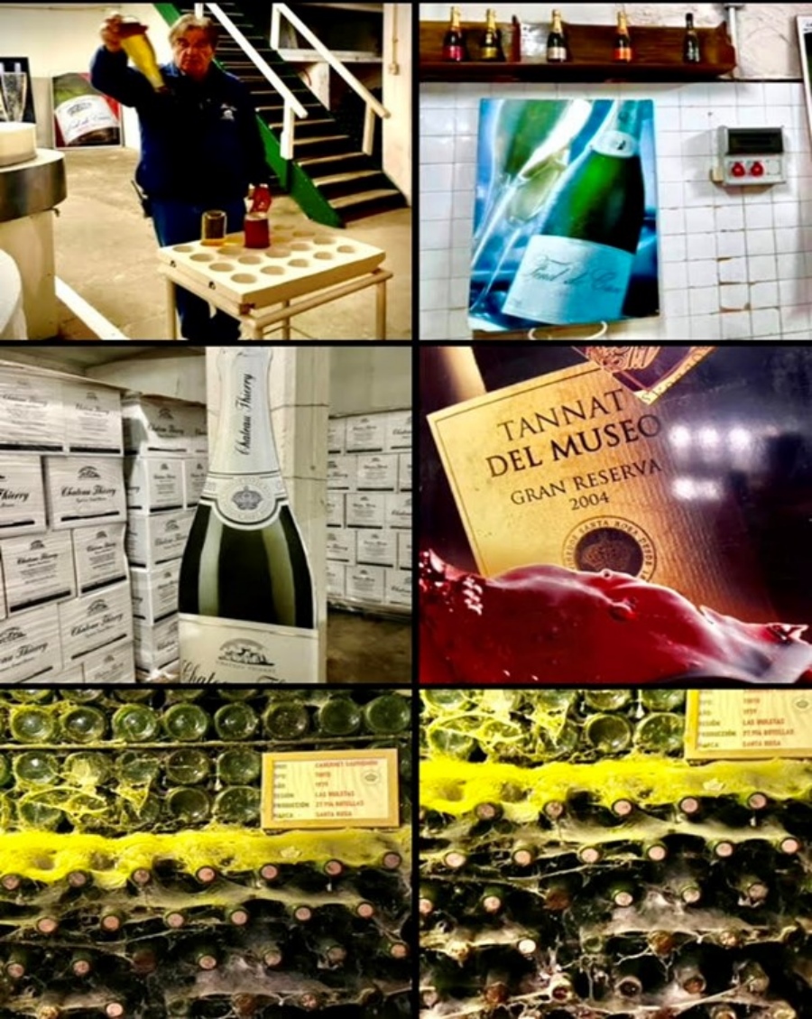1.El propietario actual de la bodega, Juan José Passadore es la 4ª generación, explica al grupo el proceso del espumante.  2. Arriba los premios obtenidos, debajo productos destacados de la bodega y menciona al Fond de Cave. 3. Otra variedad Chateau Thierry Demisec, es un vino blanco frizzante. 4. Premio 2004, Tannat Gran Reserva. 5. En la cava y a resguardo entre varios el Cabernet Sauvignon (Tinto) 1979. 6 ídem.