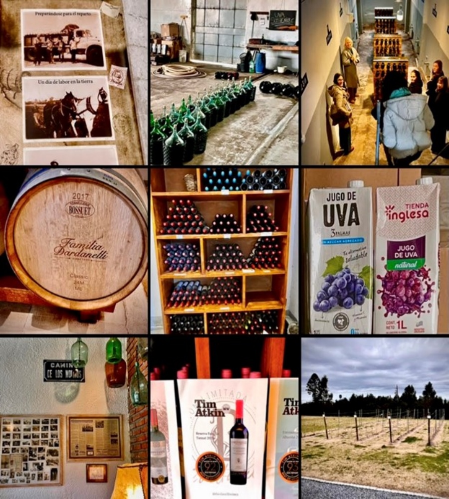 1.Hay una serie de fotografías que cuentan la historia de los ancestros europeos; 2. Las damajuanas persisten en los almacenes; 3. Parte de la charla de Alba Dardanelli que ofreció al grupo; 4. Barrica; 5. Variedad de vinos que produce la empresa; 6. Elaboran jugo de uva para Tienda Inglesa (sin fermentar, no lleva azúcar, ni levaduras); 7. Se ubica en calle Caminos de los Molinos como establece el cartel; 8. Premios obtenidos; 9. La vid en sus cuatro variedades porque a los visitantes les gusta probar del propio viñedo, expresó la propietaria.