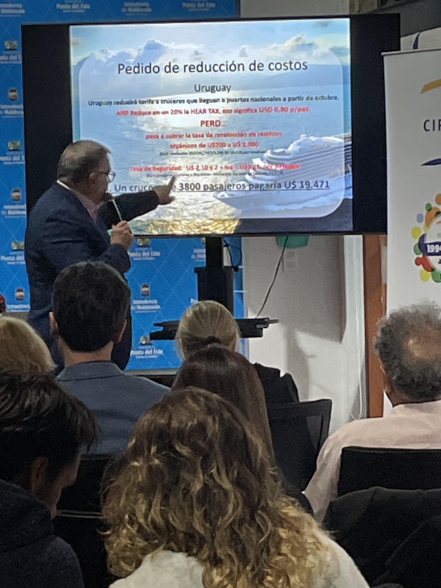 *Necesidad de bajar los costos porque todas las compañías lo están tratando y la tasa en Sudamérica cuesta bastante, más del 50% se va en tazas portuarias. En Argentina, Daniel Scioli pidió la baja hasta un 60% de las tazas portuarias; en Brasil se reunió el Embajador de EE.UU. para bajar costos impositivos y así poder trabajar con ellos. Uruguay se presentó en Seatreade (Feria en Miami) a través de MINTUR con Remo Monzeglio y presidente de ANP, también la comisión de turismo de PdE hicieron un trabajo excelente al reunirse con todos los capos de las compañías, pero qué más se puede hacer (¿?)