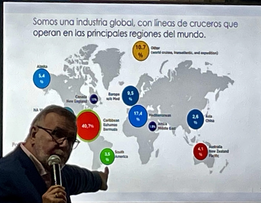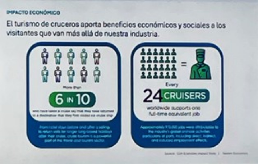 *Impacto económico que genera el crucerismo: el negocio es muy grande explicó Pera y consta de 2 patas, una es la que todos conocemos, y la 2da es la que se da arriba del barco y fundamenta el negocio de este producto que se da con la venta de tickets arriba del barco; además el crucero debe estar ocupado casi al 100% siempre porque si bien se baja el costo del mismo, la ganancia está en la cobertura de los servicios, venta de shows, peluquería, masajes, restaurantes diversos, casinos… esto significa que si no se venden todas las cabinas igual da ganancias y genera trabajo, más del 75% de puestos de trabajo son generados en la zona terrestre de los puertos.
