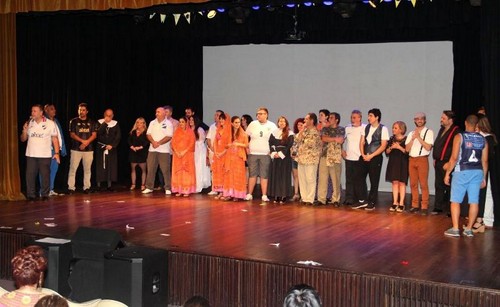 Final de la obra con todos los artistas en escena. El Dr. Carlos Pera, de Aeromundo agradecido