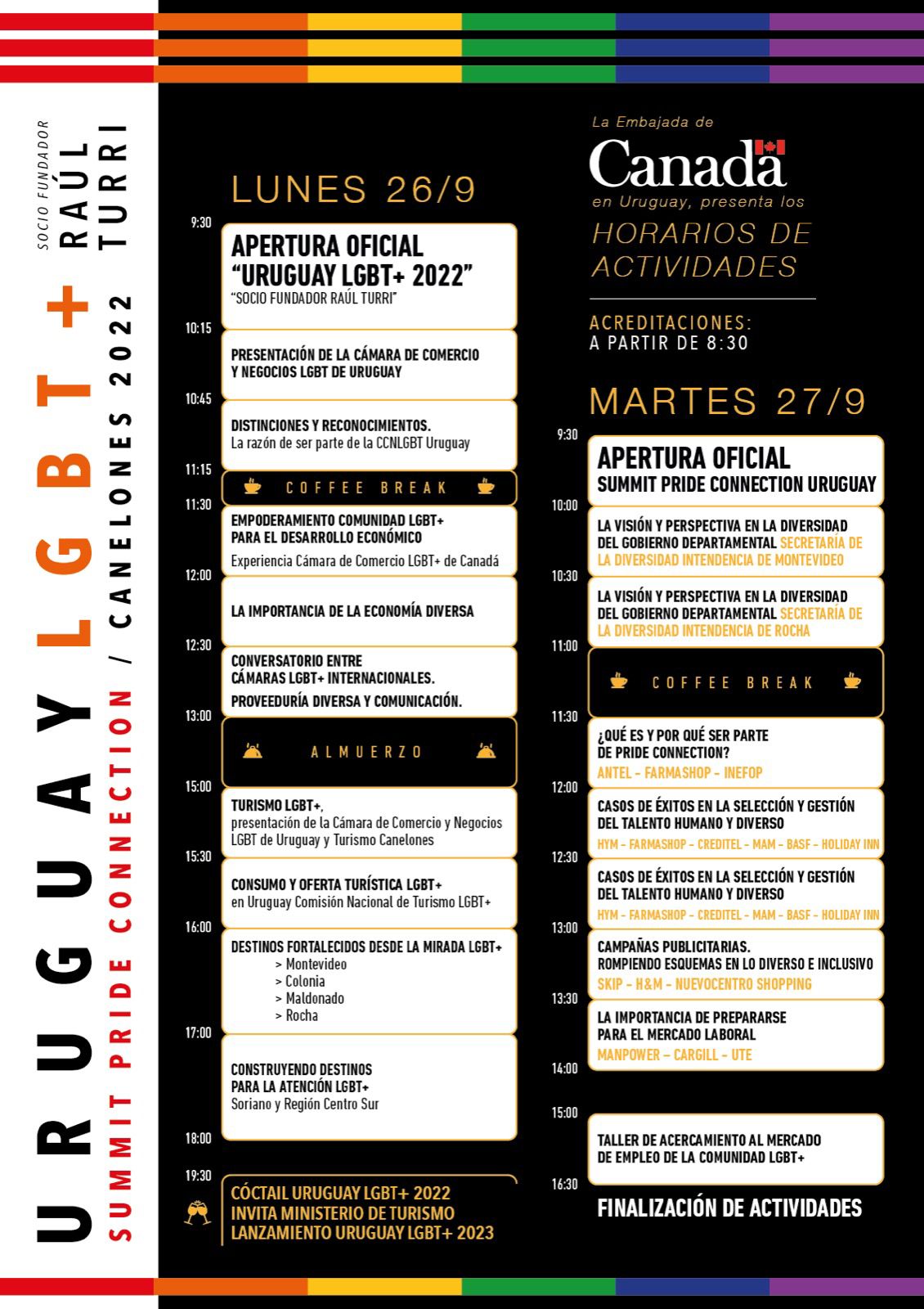 La inauguración oficial de Uruguay LGBT+ 2022, será el lunes 26 de septiembre, a las 09.30, y las sesiones se extenderán hasta el cóctel que a las 19.30, ofrecerá el Ministerio de Turismo, en el que se realizará el lanzamiento de la 8ª edición de 2023. Mientras que el martes 27 -Día Mundial del Turismo-, la apertura de Summit Pride Connection (*) Uruguay se va a realizar a las 09.30 horas. La actividad finalizará a las 16.30 horas. (Ver horarios al pie de esta nota).