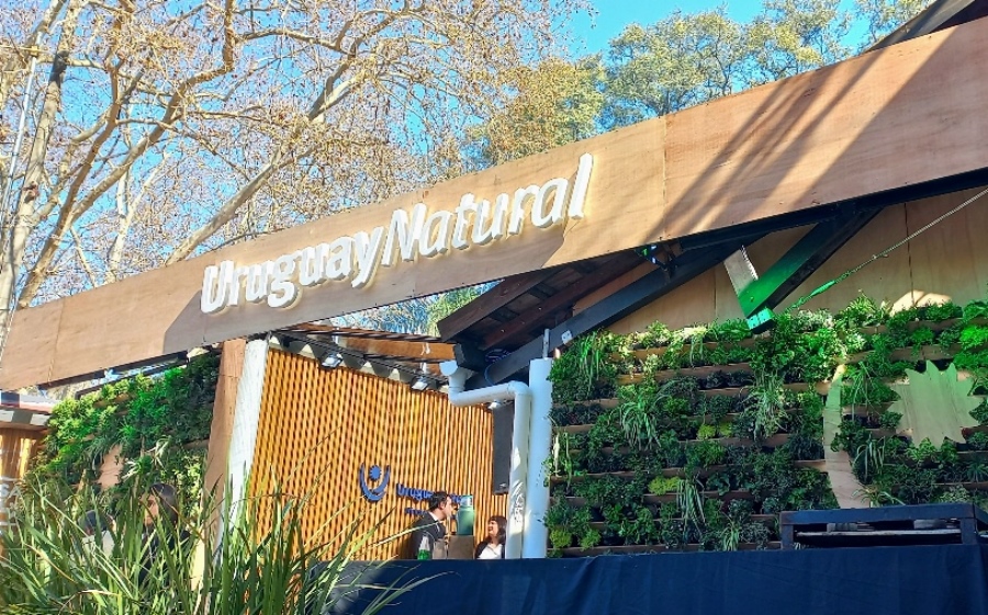 El stand del Ministerio de Turismo luce totalmente renovado, con revestimiento de madera y una pared de plantas verdes, donde destaca el logo de Uruguay Natural.