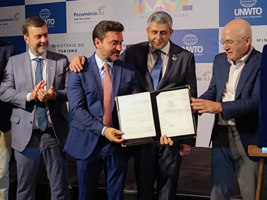 Marcelo Freixo, Pte. de EMBRATUR; Gustavo Santos, director regional de la OMT para las Américas; Celso Sabino, ministro de Turismo de Brasil; Zurab Pololikashvili, secretario general de la OMT; Antonio Florencio de Queiroz Jr., Pte. Pte. Sistema Fecomércio RJ