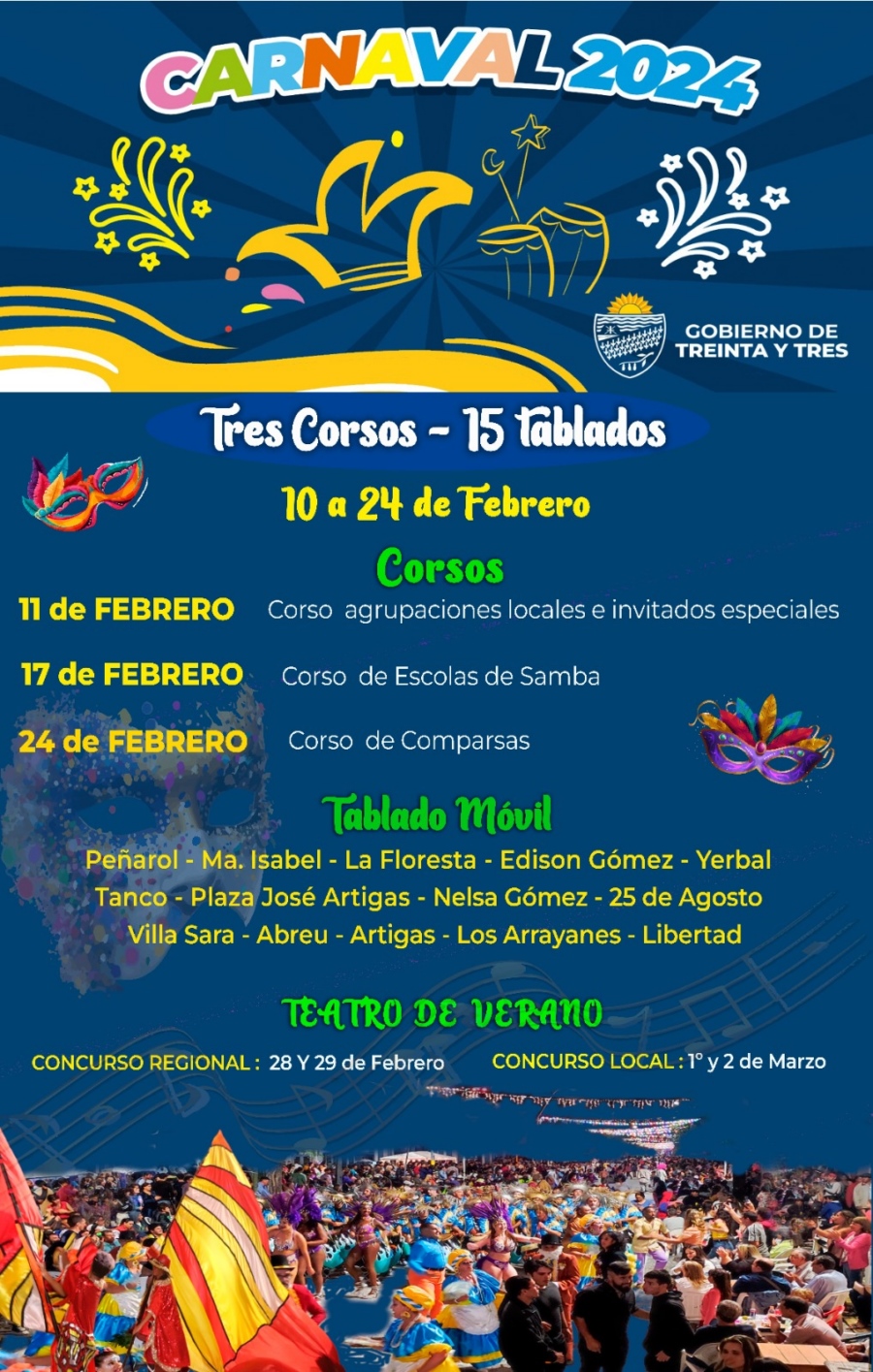 La capital departamental se apronta para celebrar tres grandes eventos carnavalescos; el domingo 11 será el 1er corso del Carnaval de Treinta y Tres; así como el sábado 17 y el sábado 24. Van a participar las mejores escuelas de samba y comparsas del carnaval de Montevideo. Y habrá 15 tablados en distintos puntos de la capital, a partir del sábado 10 de febrero.