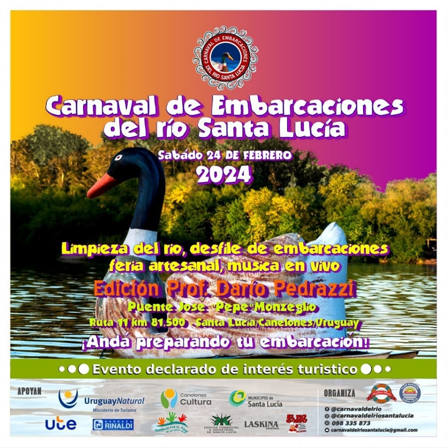 La 8ª edición del Carnaval de Embarcaciones del Río Santa Lucía tendrá lugar el sábado 24 de febrero, a partir de las 18.00. La fiesta que fue inspirada en el Carnaval de Venecia, tiene como centro las inmediaciones del puente José "Pepe" Monzeglio, ubicado sobre ruta 11 km 83, ciudad de Santa Lucía. El evento, que ha reunido en sus últimas ediciones a unas 4.000 personas y a más de una decena de embarcaciones alegóricas concursantes, comenzará con el desfile náutico que se extenderá hasta el anochecer. Los organizadores, el Club Náutico Santa Lucia y el Colectivo Reflote, invitan al público a participar con su bote, su kayak o su canoa, para disfrutar de un Carnaval distinto; la inscripción y la entrada son gratuitas. Se espera que este año participen embarcaciones de Paysandú, Florida, Cerrillos y las del pueblo. Al caer la noche, el espectáculo continuará en el escenario artístico; hasta la medianoche, habrá plaza de comidas, juegos infantiles y feria de artesanos