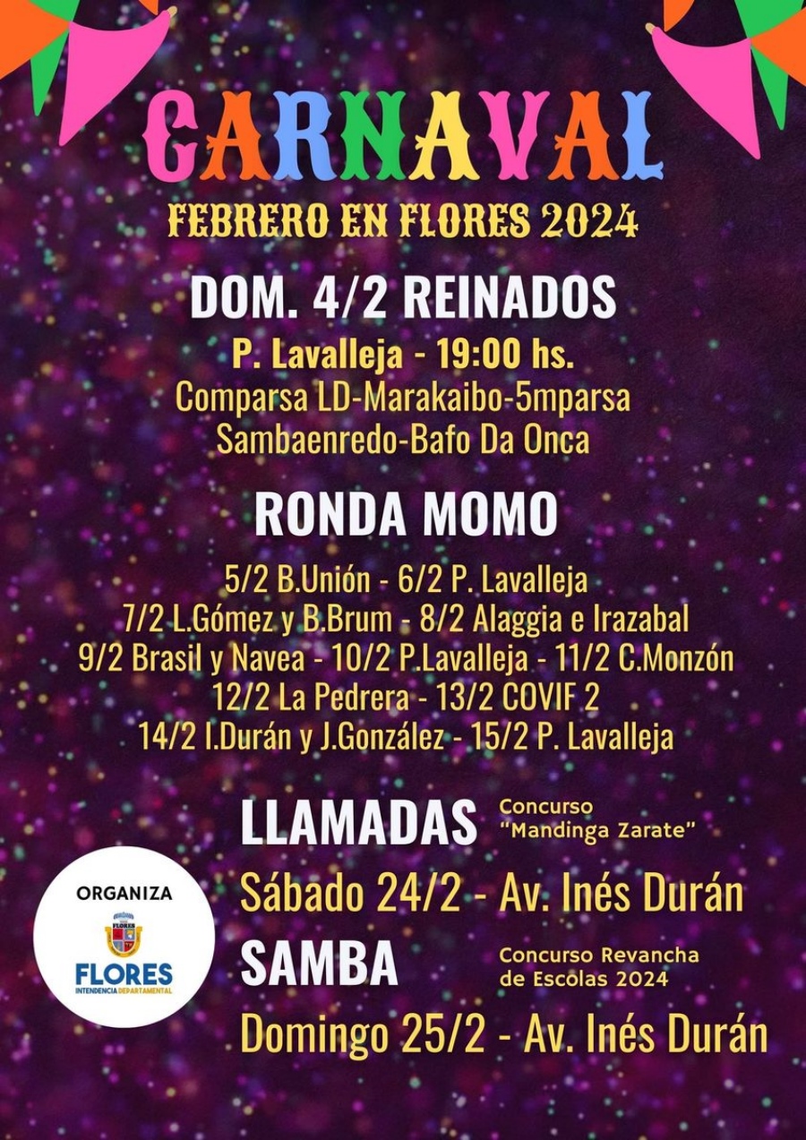 El sábado 10 se realizará el Desfile y Concurso de Lubolos en Mercedes. La ciudad de Dolores tendrá su Desfile de Carnaval el sábado 17 de febrero y llegará a Cardona el sábado 24.