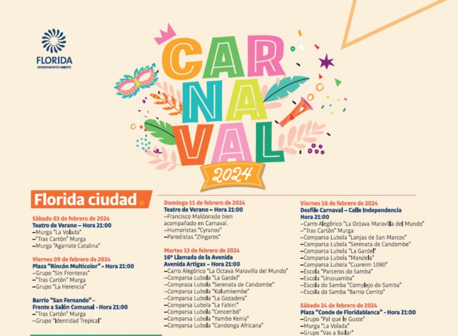 El Carnaval en el departamento de Florida despliega un cronograma de actividades tanto en la capital departamental como en localidades del interior. El domingo 11, en el Teatro de Verano capitalino se presentan Francisco Maldonado, humoristas “Cyranos” y parodistas “Zingaros”.