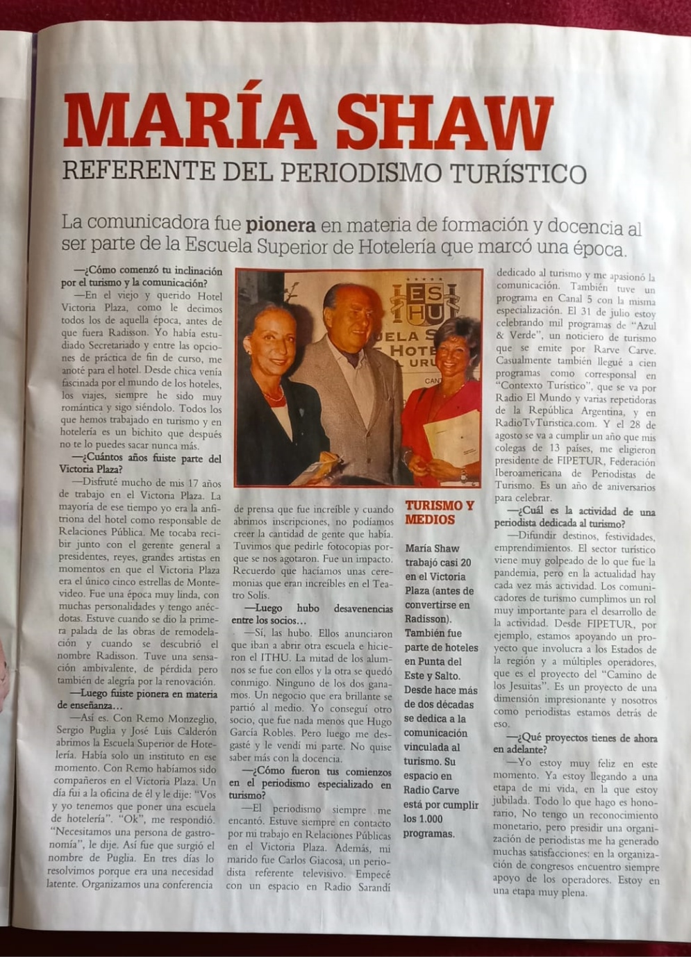 María Shaw trabajó casi 20 años en el Victoria Plaza (antes de convertirse en Radisson). También fue parte de hoteles en Punta del Este y Salto. Desde hace más de dos décadas se dedica a la comunicación vinculada al turismo. Hoy, su espacio en Radio Carve cumplió mil programas.