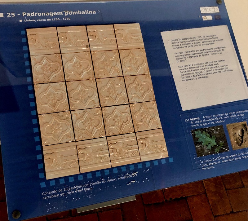 Galería de imágenes: 1.- Padrón de Azulejos Pombalinos. 2.- Padrón de Azulejos Pombalinos. 3.- Salón donde está la Panorámica general de la ciudad de Lisboa. 4- Parte del Gran Panel de Lisboa, hace referencia a los edificios de la época. 5.- Las Musas Polímnia, Euterque y Tália. Lisboa 1670-75. Era del Palacio del Márquez de Marialva. 6.- Fachada contemporánea, Joana Vasconcelo. Porto, 2016. Ejemplo de cambio. 7. - Fachada de la Iglesia de Bentos en Lisboa revestida de azulejos. 8. - Interior del hall revestido con azulejos-entrada a Estación de Ferrocarriles de Lisboa. 9.- Pisos en calles y plazas de las ciudades. 10- Monumento en Lisboa, barrio y residencia del escritor portugués Pessoa. 11. Poema al mar escrito de Pessoa. 12.- Fachada residenciales en tonos de azul y blanco. Porto. 13.- Pisos con peces en calles y plazas de Porto. 14.- Fachadas contemporáneas de residencias de Porto