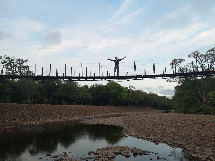 A la salida de Valle Edén algunos integrantes del grupo no resistieron la tentación de cruzar el puente colgante peatonal sobre el arroyo Jabonería.