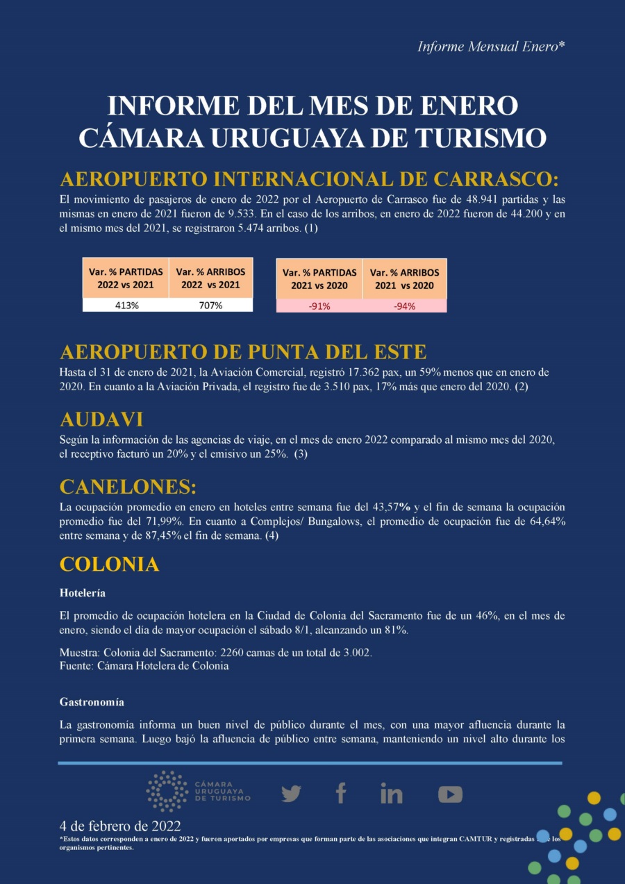La Cámara Uruguaya de Turismo emitió su informe mensual correspondiente a enero de 2022. El mismo se elaboró el 4 de febrero, con datos aportados por empresas que forman parte de las asociaciones que forman la CAMTUR, registradas ante los organismos competentes.
