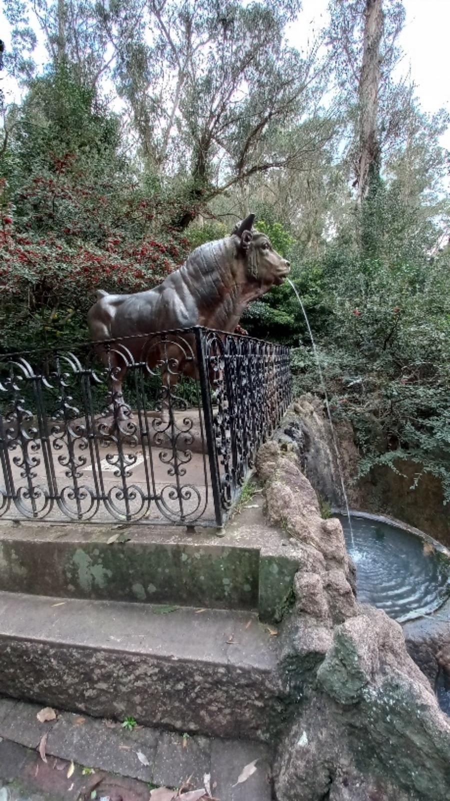 El parque al pie del Cerro del Toro y la Fuente del Toro, ubicada a 100 metros sobre el nivel del mar, es el lugar más energético de Piriápolis, lo que hace de esta zona un templo a cielo abierto. Para acceder a la Fuente del Toro debemos subir 33 escalones… Según la historia, Piria no se cansaba de afirmar que las aguas de los tres manantiales tenían propiedades curativas… Todos nos apresuramos a tomar el agua mineral de un chorro que surge de la boca del poderoso toro de hierro, de tamaño natural, que representa la fuerza, la energía generadora. La surgente de agua mineral nace 30 metros arriba, y fue canalizada para que desde la boca del toro caiga sobre el resto de la fuente tallada en la roca, en un entorno de tupida vegetación autóctona y un bosque de eucaliptus.