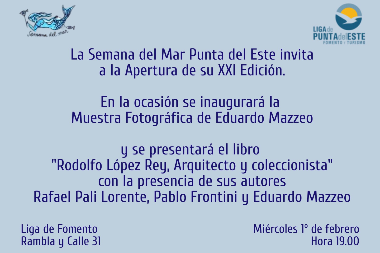 Miércoles 1° - Apertura de la XXI edición de la Semana del Mar, con la inauguración de la muestra fotográfica de Eduardo Mazzeo, arquitecto y fotógrafo uruguayo, autor de los libros Sense y Monocromos. Él además, junto a los arquitectos Rafael ‘Pali’ Lorente y Pablo Frontini, va a comentar el libro que han escrito entre los tres: “Rodolfo López Rey: arquitecto y coleccionista”.