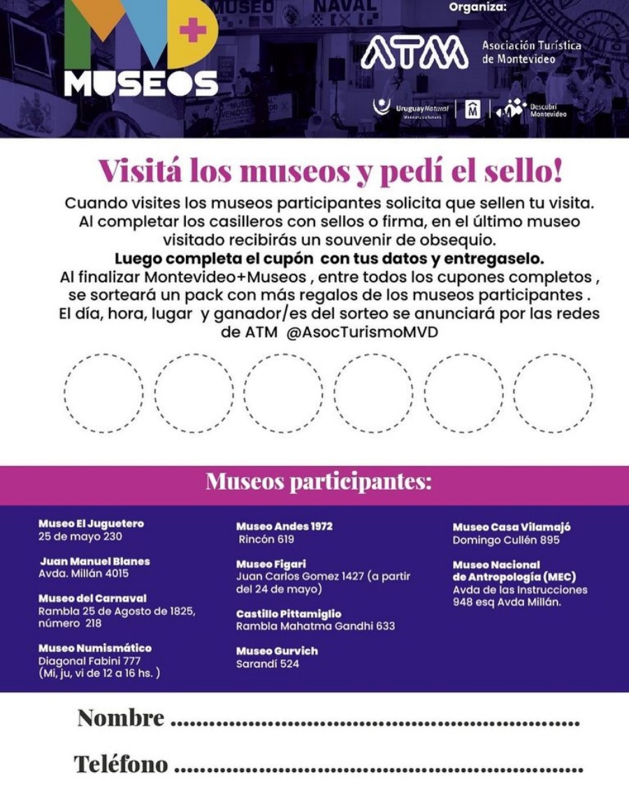 En los museos participantes habrá una cartilla para que sea sellada en cada visita durante el mes de mayo. Al completar los casilleros con sellos o firma, en el último museo visitado el visitante recibirá souvenirs de obsequio. Se debe completar el cupón con los datos y entrégalo para participar en un sorteo de un pack con regalos de los museos participantes. El día, hora, lugar y los ganador/es del sorteo, se anunciará por las redes sociales de la Asociación Turística de Montevideo.