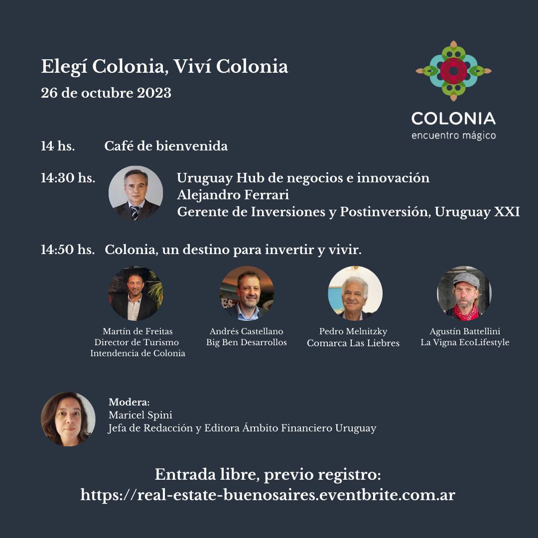 A continuación, con la participación de Maricel Spini, jefa de Redacción y editora de Ámbito Financiero Uruguay como moderadora, se presentará al Departamento de Colonia como destino de inversiones y se compartirán las experiencias de argentinos que han elegido Colonia para invertir y como su residencia.
