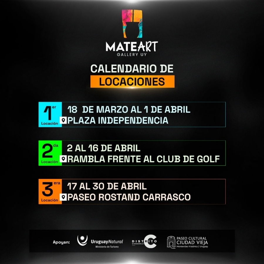Mate Art Gallery se estrena el lunes 18 de marzo a las 18.00 horas, y se extiende hasta el lunes 1° de abril de 2024, en la Plaza Independencia de Montevideo. Entre el 2 y el 16 de abril se muda a la Rambla, frente al Club de Golf de Punta Carretas. Y del 17 de abril hasta el 1° de mayo llegará a Carrasco, al Paseo Rostand.