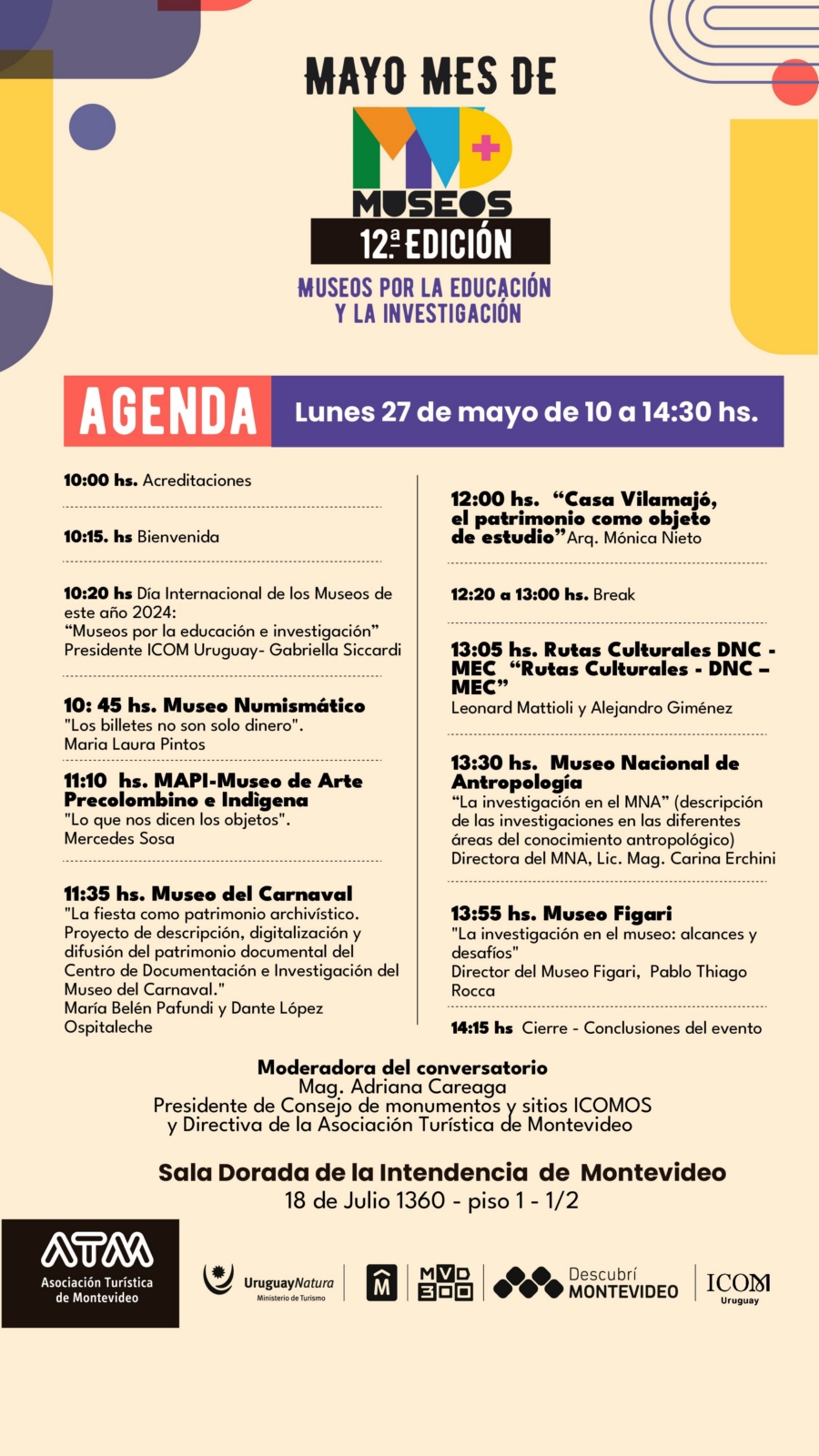 En el marco de la 12ª edición de "Montevideo + Museos", un programa exclusivo de la Asociación Turística de Montevideo, los socios se complacen en invitar a un conversatorio que se llevará a cabo el próximo lunes 27 de mayo, de 10.00 a 14.40 horas, en la Sala Dorada, piso 1 y ½ de la Intendencia de Montevideo.