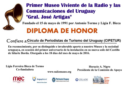 El Círculo de Periodistas de Turismo del Uruguay (CIPETUR) recibió un Diploma de Honor entregado por el Primer Museo Viviente de la Radio y las Comunicaciones del Uruguay “Gral. José Artigas”.