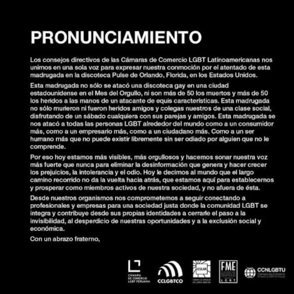 Pronunciamiento de los consejos directivos de las Cámaras de Comercio LGTB de latinoamérica.