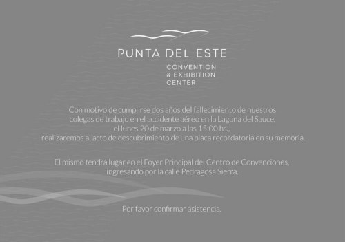 A dos años de esta tragedia, la gerencia de  Punta del Este Convention & Exhibition Center, rendirán homenaje a los  fallecidos, con el descubrimiento de una Placa Conmemoratoria el próximo lunes 20 de marzo a la hora 15 en el Foyer Principal del Centro de Convenciones ( entrada principal, por Pedragosa Sierra)