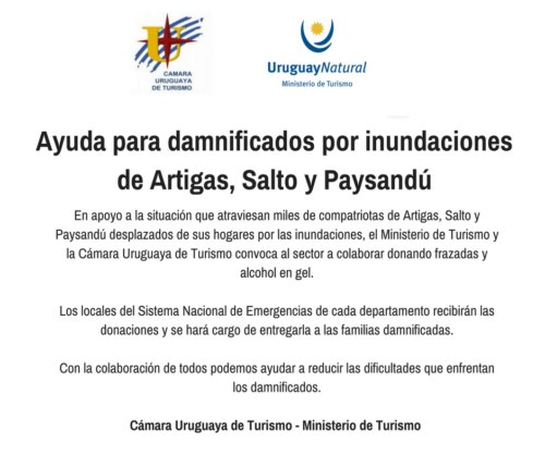 El Ministerio de Turismo y la Cámara Uruguaya de Turismo invitan al sector turístico de todo el país a colaborar con los miles de compatriotas que han sido desplazados de sus hogares debido a las inundaciones que afectan al norte del país.