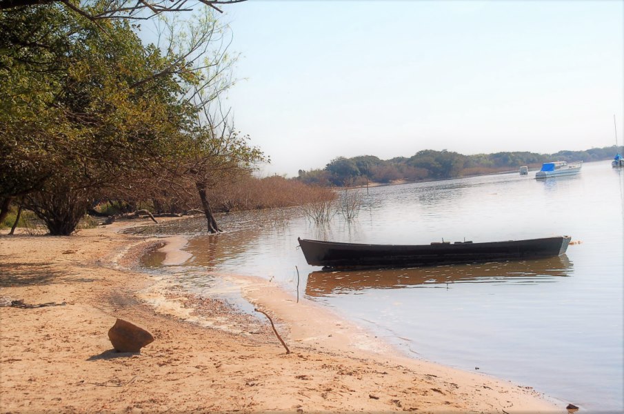 Navegando el “cielo azul que viaja, pintor de nubes, camino con sabor a mieles ruanas”, como describe Aníbal Sampayo al Río Uruguay; frente a la enorme Isla del Queguay Grande y a la vecina República Oriental, un gigante de chapas raídas se impone sobre la costa de la provincia entrerriana en la República Argentina.