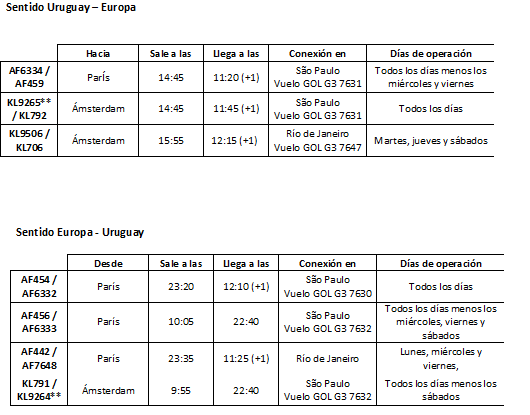 En efecto, en el marco del partnership comercial estratégico entre Air France-KLM y GOL, que en febrero de este año cumplió 3 años, los tiempos de conexión de los vuelos de Air France-KLM y GOL desde y hacia Montevideo han sido mejorados para poder ofrecer a los clientes uruguayos más de quince opciones de vuelos entre Uruguay y Europa, vía São Paulo o Río de Janeiro.