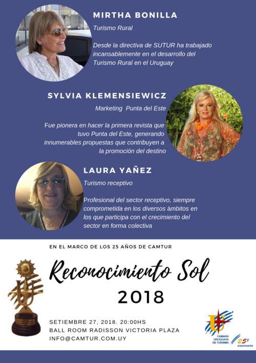 Este año, los reconocimientos los recibirán tres damas: Mirtha Bonilla, quien desde la directiva de la SUTUR ha trabajado incansablemente en el desarrollo del Turismo Rural. Sylvia Klemensiewicz pionera en editar la primera revista que tuvo Punta del Este, generando innumerables propuestas que contribuyen a la promoción del destino. Laura Yañez, profesional del turismo receptivo, siempre comprometida -en los diversos ámbitos en los que participa- con el crecimiento del sector en forma colectiva.