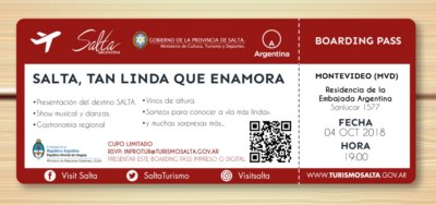 Galería de imágenes: 1.- Invitación “boarding pass” para el evento de Salta. 2.- Salta en el jardín de la Embajada de Argentina. 3.- Presentación por parte de Laura Alcorta, subsecretaria de promoción turística de Salta y Sebastián Simón, junto al Embajador de Argentina Mario Barletta. 4.- Gastón de Chazal, gerente de Aerolíneas Argentinas en Uruguay; Laura Alcorta, subsecretaria de promoción turística de Salta y Gustavo Dimecola, presidente de FEAVYT filial Salta.